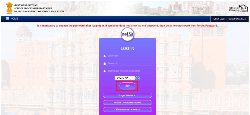 - जानकारी भरने के बाद, अपने Shala Darpan खाते में सुरक्षित रूप से प्रवेश करने के लिए Login बटन पर क्लिक करें।